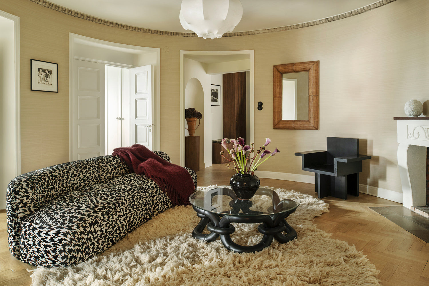 "The entire round room is my favorite and the reason we impulsively bought this apartment. I love the mirrored doors, the fireplace, and the almost 100-year-old decorative ceiling painting. It all pairs perfectly with our incredible arched sofa in a print designed by Eley Kishimoto.”