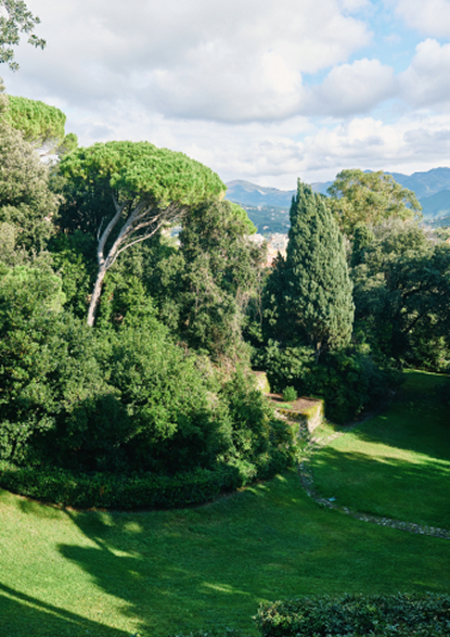 The house architecture reflects Italian rationalism, with clean geometries, horizontal lines, and a structure that follows the natural slope of the landscape. Large windows and continuous glazing connect the interior with the surrounding park and sea views, creating an open, flowing spatial experience.