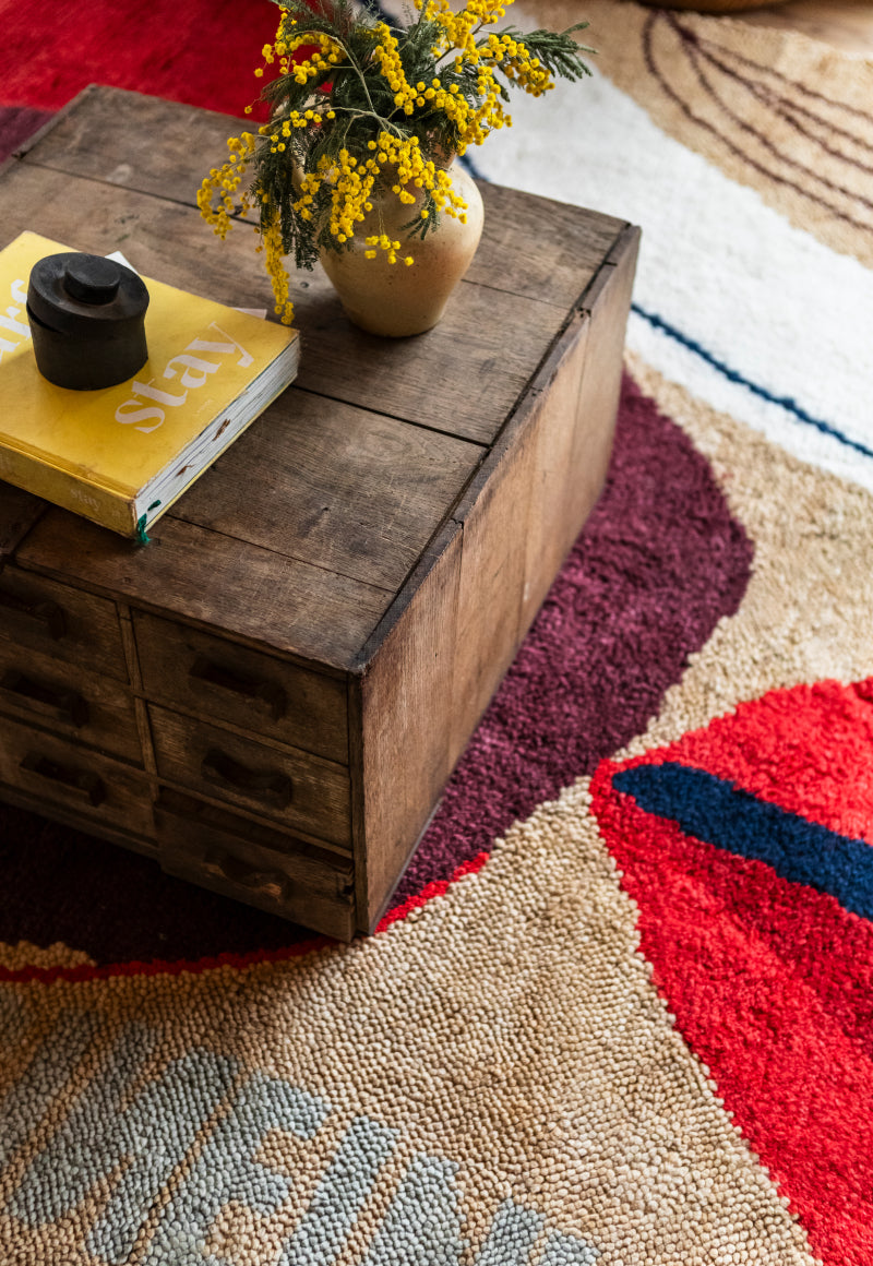 Kaleidoscope is a rug that reimagines a pivotal artwork from an experimental period in Heather Chonto’s career—when she began working with antique linen and found fabrics. The result is a dynamic composition of color, form, and contrast, infused with traces of movement, exploration, and transformation. Through meticulous craftsmanship, the rug translates the original painting’s tactile qualities and intricate color play into a contemporary textile. It captures Chonto’s artistic vision in both hue and texture—offering a bold yet nuanced expression for the modern interior.