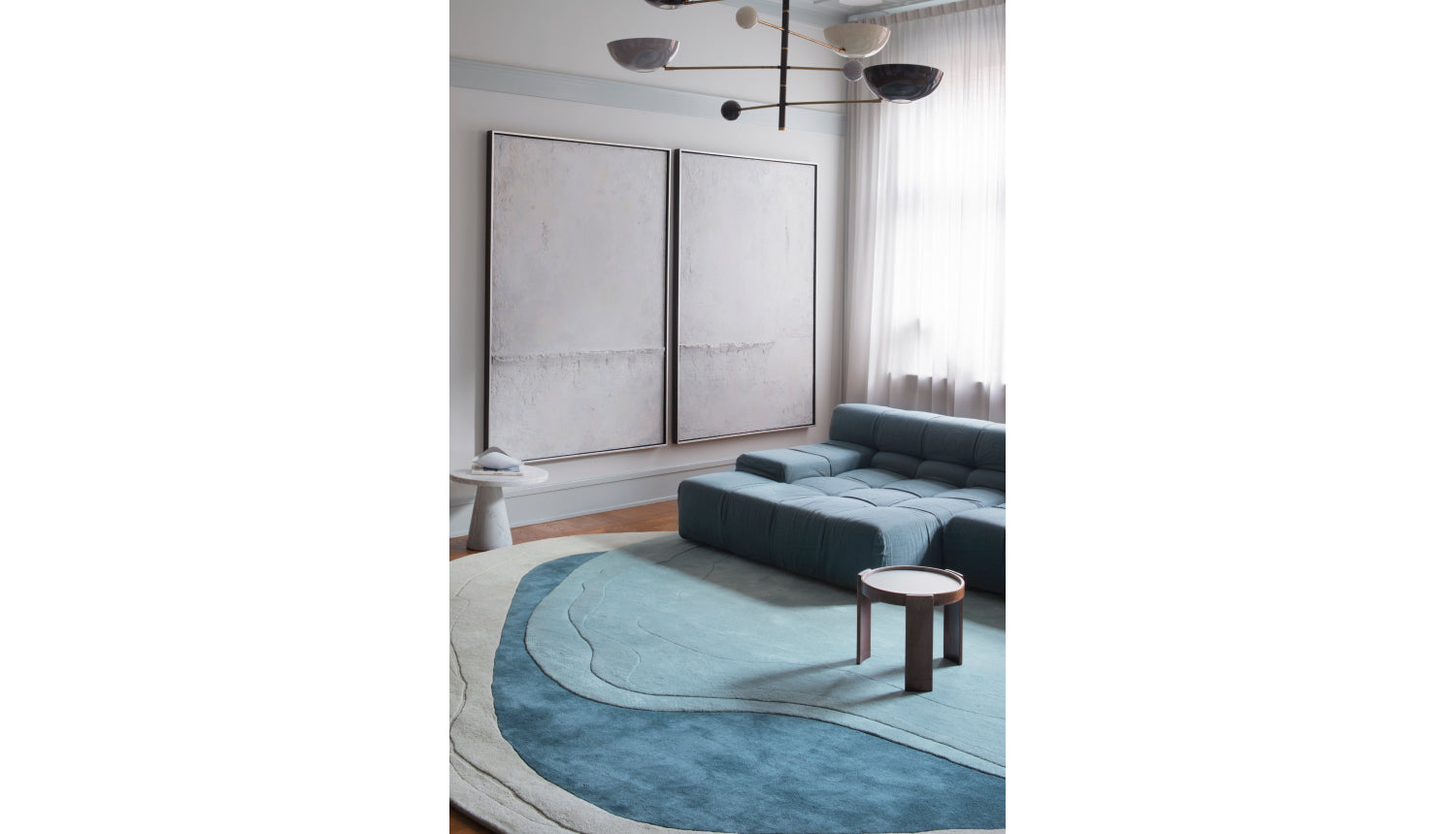 The organic form allows for more freedom in placing furniture, making the room feel more versatile and interesting. It creates natural passage ways; for example, you can place lounge chairs asymmetrically, on or half off the rug, without it looking misplaced. It reinforces harmony if you choose other organic-shaped furnishings, but it also adds a softening contrast and balance if your furniture is more rigid and symmetrical."