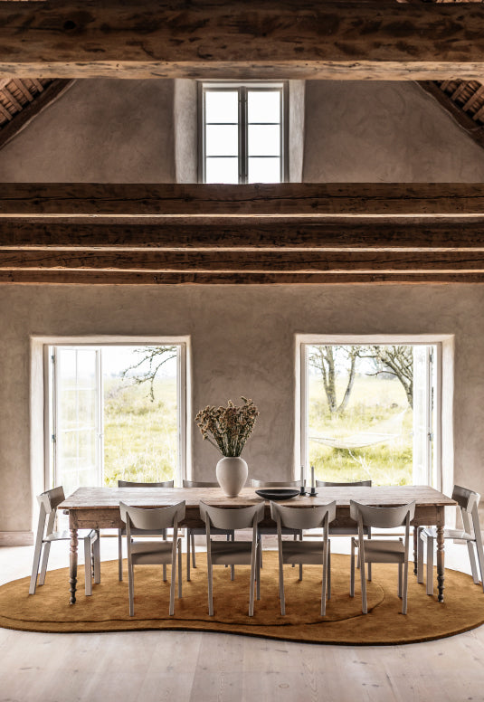 With its oval shape and balanced proportions, Residue brings a subtle sense of movement to the room. The collection is hand-tufted by skilled artisans in India using 100% wool. Its sculptural silhouette creates a quiet contrast between simplicity and texture, and is also available as a hand-knotted shag for a more tactile expression.