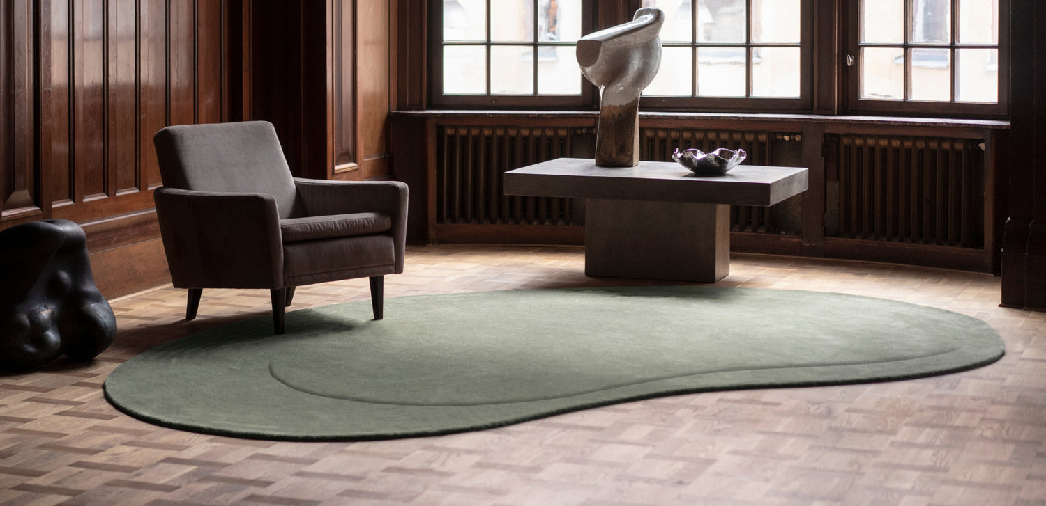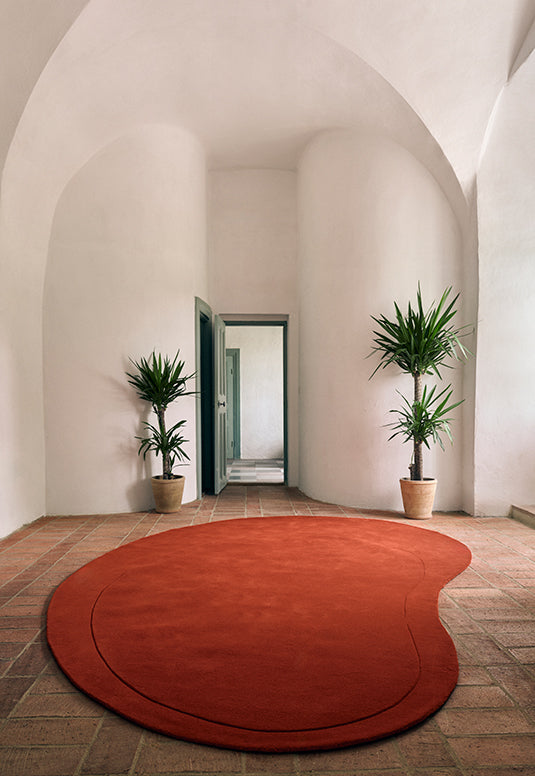 The collection’s unique kidney shape makes each rug easy to place in any space, creating an interesting dynamic atmosphere.