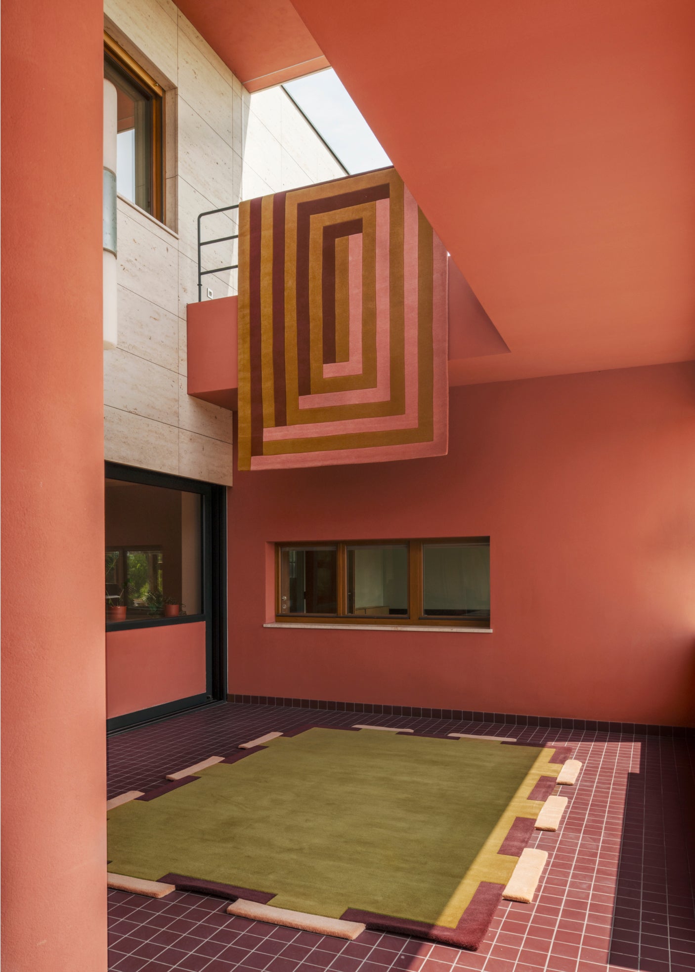 Inside, the house reveals a softer side: travertine floors, marble bathrooms and warm wood details create a refined, cinematic atmosphere. Light and shadow shift throughout the day, much like the optical effects woven into the collection’s patterns.